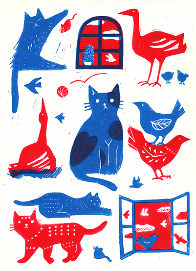 小平彩見の版画作品と、壁に貼った猫や鳥の切り絵、鳥もビールなどを吊るし、空間も楽しめる展示です。