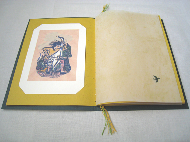 手製本 えほんサイズ:195×140(mm) 表紙 :厚紙 ステッチ:麻糸2色 ステッチ中とじ 限定45部 版画作品印刷3点